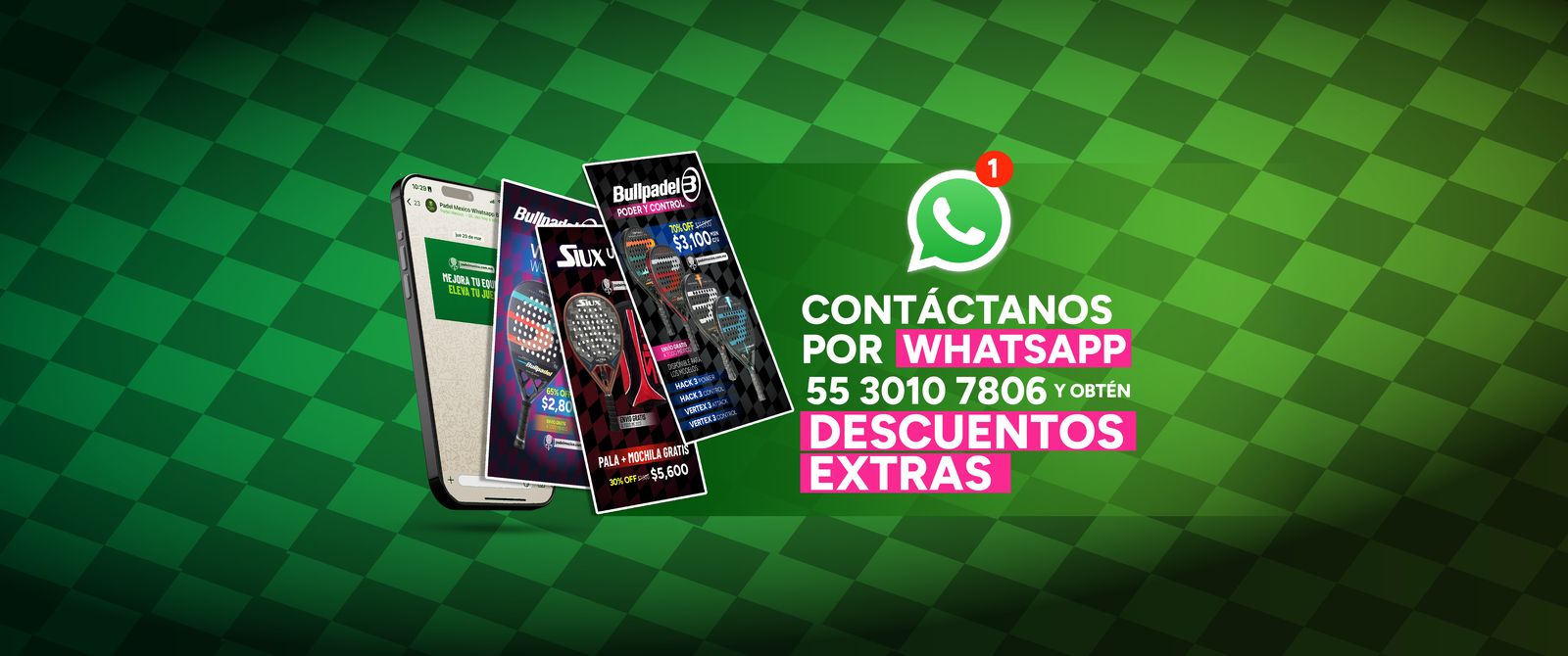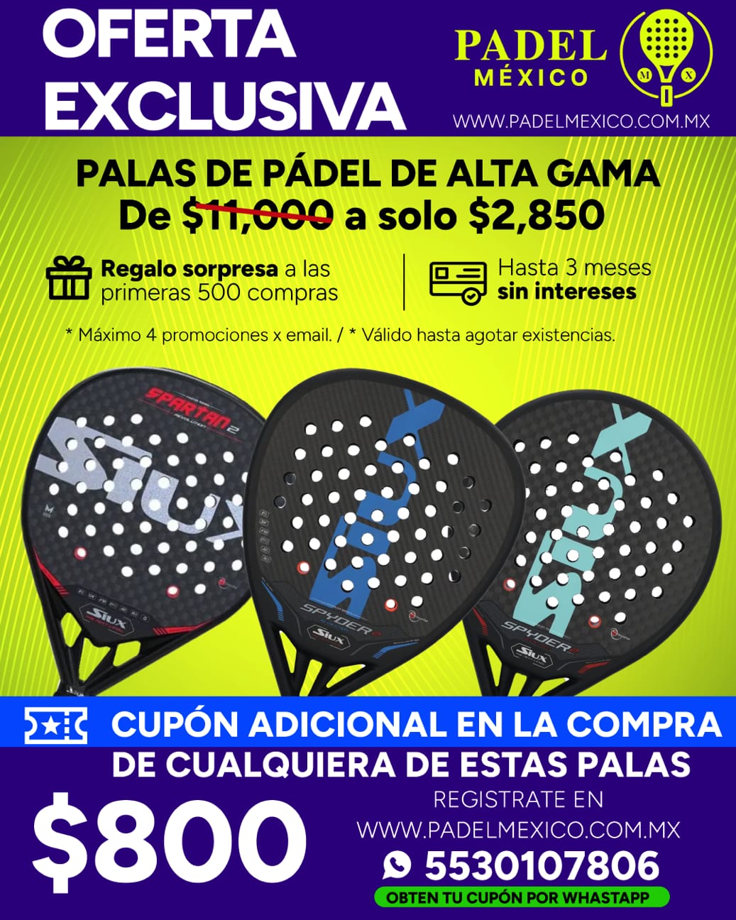 Registrate en la pagina Mandanos un Whatsapp y Recibe $800 mxn de descuento en la compra de las palas SIUX SELECCIONADAS