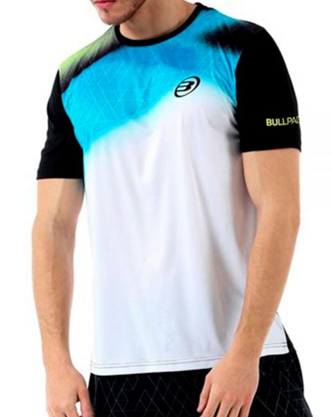 La camiseta Bullpadel Ilitia en color negro, presenta un diseño atractivo con detalles en blanco y azul, que te ofrece un ajuste cómodo que se adapta a la silueta del cuerpo, permitiendo movimientos libres sin restricción alguna.