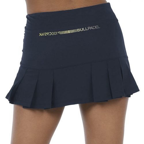 Conoce la falda Bullpadel Duro en color azul marino, destacando por su diseño y confección en tejido elástico con mezcla de taffeta, que te ofrecerá total comodidad y libertad de movimiento dentro de la pista, perfecta para las jugadoras que buscan total confort en sus partidos de padel.